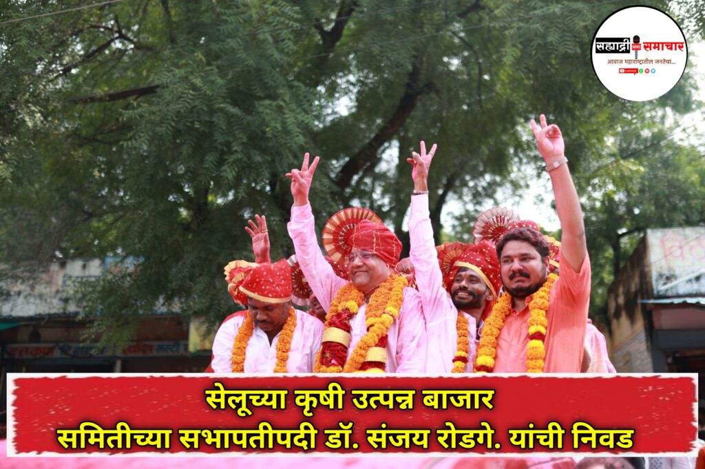 सेलू – कृषी उत्पन्न बाजार समितीच्या सभापती पदी डॉ. संजय रोडगे यांची बहुमतांनी निवड करण्यात आली. मागील अनेक दिवसापासून बाजार समितीच्या सभापती निवडीला पूर्णविराम मिळाला आहे. बाजार समितीचे तत्कालीन सभापती चक्रधर पौळ यांनी प्रकृती ठीक नसल्याचे कारण देत राजीनामा दिला होता. दरम्यान सोमवार 22 रोजी बाजार समितीच्या सभागृहात निवडणूक निर्णय अधिकारी संदीप तायडे यांच्या अध्यक्षतेखाली संचालक मंडळाच्या विशेष बैठकीचे आयोजन करण्यात आले होते. सकाळी 11 वाजता उमेदवारी अर्ज भरणे तर 11:15 अर्जाची छाननी व बारा वाजता प्रत्यक्ष निवड प्रक्रिया सुरुवात करण्यात आली. कृषी उत्पन्न बाजार समिती ही दिनांक 24/10/1931 रोजी अस्तित्वात आलेल्या बाजार समिती आजपर्यंत सभापती आणि प्रशासकीय अधिकारी यांचे एकूण १३ तत्कालीन सभापतीने कारभार चालवला.
