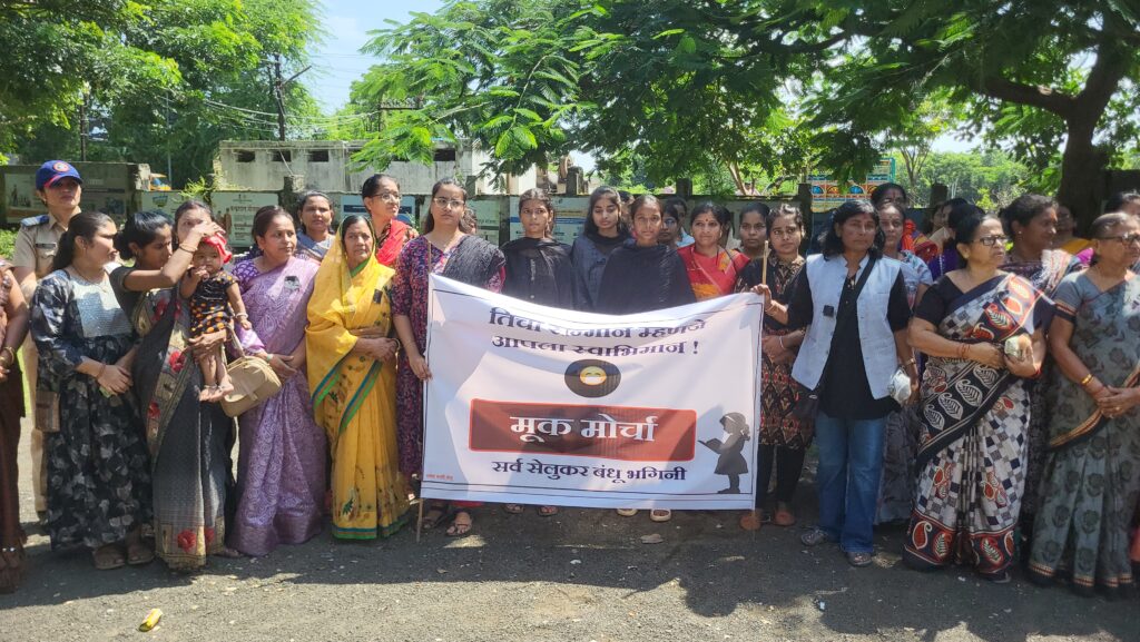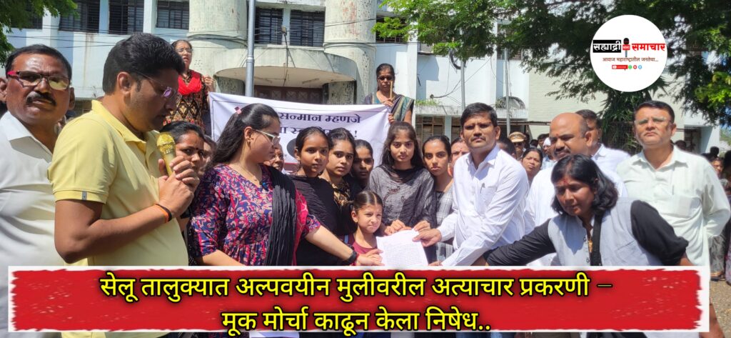 सेलू (ता. परभणी) : सेलू शहरातील अल्पवयीन मुलीवरील अत्याचार प्रकरणात आरोपीवर कठोर कारवाई व्हावी, पीडितेला न्याय मिळावा तसेच प्रकरणाची सखोल चौकशी विशेष तपास पथकाकडून (SIT) करण्यात यावी, या मागण्यांसाठी आज दिनांक ७ ऑक्टोबर २०२५ रोजी सेलू शहरातील लोकमान्य टिळक पुतळ्यापासून ते उपविभागीय अधिकारी कार्यालय सेलू असा मूक मोर्चा काढून महाराष्ट्र राज्याचे मुख्यमंत्री यांना उपविभागीय अधिकारी कार्यालय, सेलू यांच्या मार्फत निवेदन देण्यात आले.
