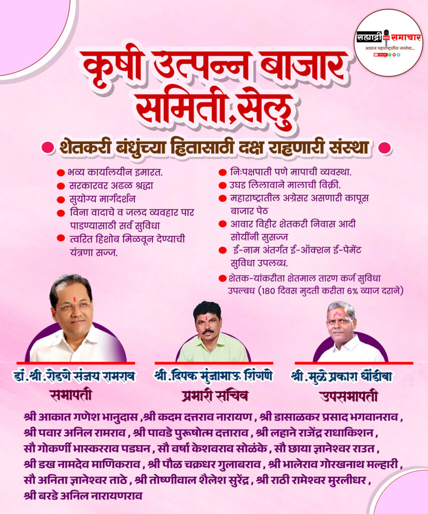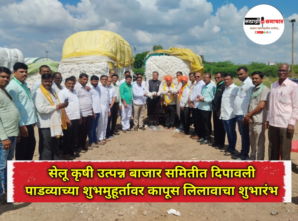 सेलू (दि. 22 ऑक्टोबर 2025) — दिपावली पाडव्याच्या शुभमुहूर्तावर सेलू कृषी उत्पन्न बाजार समितीच्या मुख्य कापूस यार्डमध्ये कापसाच्या जाहिर लिलावाचा शुभारंभ समितीचे सभापती डॉ. संजय रोडगे यांच्या शुभहस्ते करण्यात आला.
