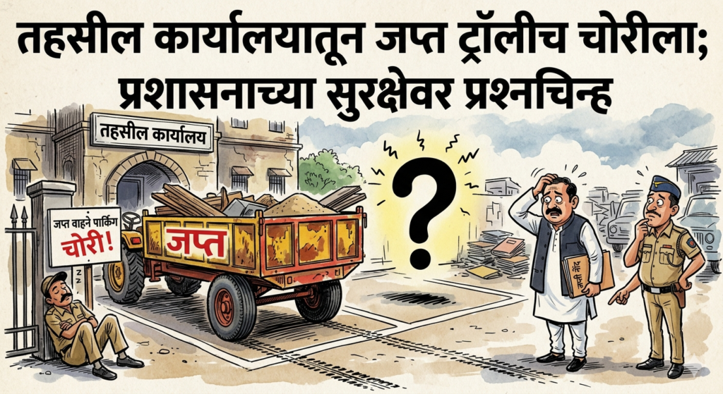 मिळालेल्या माहितीनुसार, 9 मार्च 2026 रोजी सायंकाळी सुमारे 6 वाजता सहाय्यक महसूल अधिकारी राऊत यांनी तहसील कार्यालयाच्या आवारात जप्त वाहनांची पाहणी केली असता 11 फेब्रुवारी 2026 रोजी जप्त केलेली विनाक्रमांकाची लाल रंगाची ट्रॅक्टर ट्रॉली तेथे असल्याचे दिसून आले. मात्र दुसऱ्या दिवशी 10 मार्च रोजी सकाळी 11 वाजता पुन्हा पाहणी केली असता सदर ट्रॉली जागेवर आढळून आली नाही.